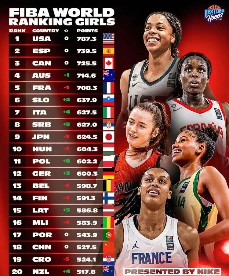 值得一提的是,亚洲球队当中,澳大利亚女篮位列第四名,日本队则是排在了第九名,而中国女篮下滑比较快,只排在了第十八名。如今才过去多久,中国U系列就已经跌到了世界第十八,很难想象,中国U系列女篮到底发生了什么。众所周知,在2025年的U19女篮世界杯中,中国女篮在小组赛中先后输给了尼日利亚女篮、葡萄牙女篮和加拿大女篮,无缘出线。