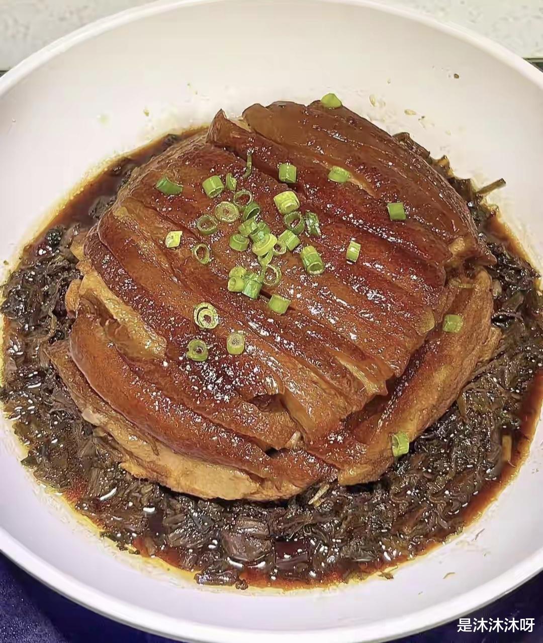 放进蒸锅里,大火蒸上一个半小时,让肉的油脂和梅菜的香气充分融合。出锅后,找一个大盘子倒扣过来,拿掉碗,哇!红亮的肉片整齐排列,下面是吸饱了肉汁的梅干菜,香气扑鼻,每一口都是满满的胶原蛋白和幸福的味道。
