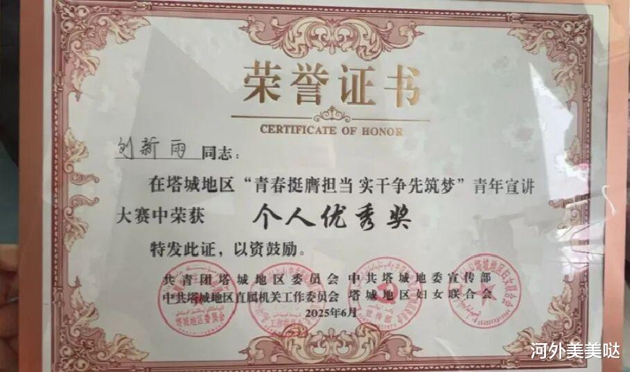 在塔城地区“青春挺膺担当 实干争先筑梦”青年宣讲大赛中,她结合自身从语言专业跨界到统计领域的独特经历,通过个人成长视角,展现西部计划志愿者与塔城发展的“双向奔赴”。最终,她的演讲打动了评委和观众,荣获个人优秀奖。并且凭借在宣讲大赛中的出色表现,刘新雨被聘任为塔城地区“青年讲师团”成员。