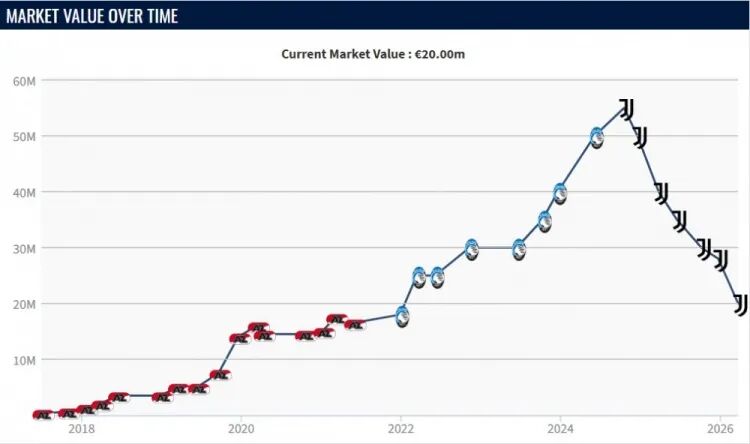 然而德转的最新数据显示,这位28岁中场的市场价值已经连续六次下跌,目前仅剩2000万欧元左右。短短一年半时间,身价蒸发超过3500万欧元。
