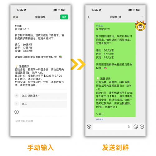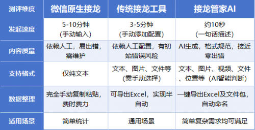 结论:相较于原生接龙和传统接龙工具,接龙管家AI能以秒级快速响应、自动创建接龙,效率提升10倍以上,且没有操作门槛,任何人都能轻松上手。