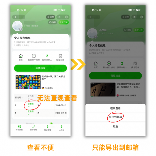 原生接龙没有任何数据整理、导出功能,所有信息都只能在接龙页面查看,且易导致刷屏,影响正常群内交流,整理数据全程全靠手动一个个汇总,耗时长易出错。