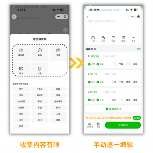 原生接龙的格式极其单一,只能支持纯文字填写,稍微复杂一点的场景,完全无法适配。
