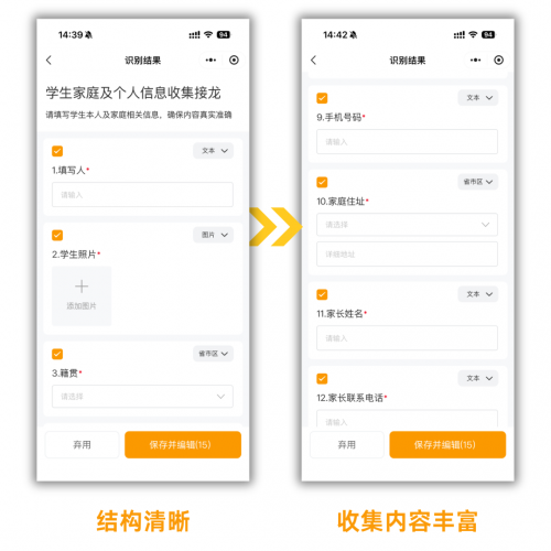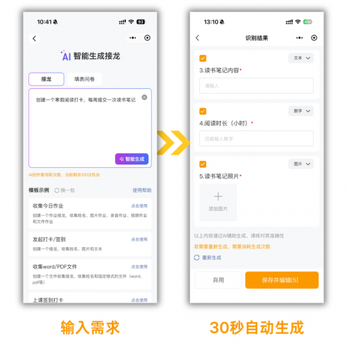 接龙质量由AI算法保障。AI能自动按要求生成内容,且采用最合理的字段类型(如电话自动设为数字格式且符合手机号的验证规范),并规避常见的手动错误,发布人仅需最终确认即可。