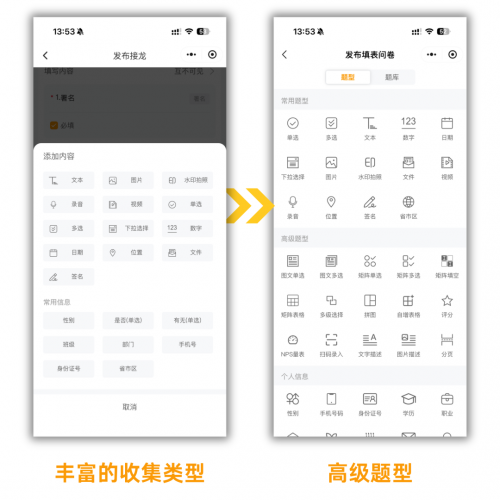 文字、图片、视频、音频、定位、签名、文件等几十种收集类型,几乎覆盖了所有日常接龙场景,比前两种方式加起来还要全面。