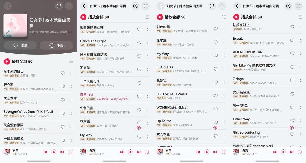 除了特辑,华为音乐还专门准备了“她本就自由无畏”的主题歌单,这里同样收录了许多女性歌手的作品,而且选曲真的很用心,不只是热门金曲,更多地是彰显女性态度的宝藏作品,就像歌单介绍说的,希望大家在歌声里感受女性力量。