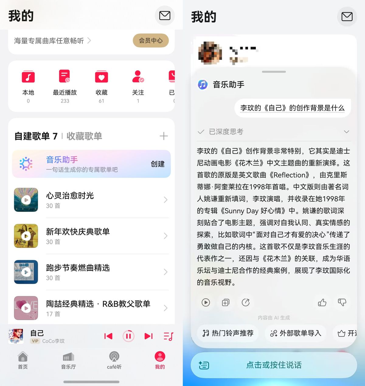 听到一半有点动容,突然对这首歌的背景有点好奇,就在华为音乐“我的-自建歌单”页面里打开音乐助手,问了问:“李玟的《自己》的创作背景是什么?”音乐助手立刻讲述起这首歌的创作背景,说这首歌是迪士尼动画电影《花木兰》中文歌曲的重新演绎,强调对自我认同、真实情感的探索。