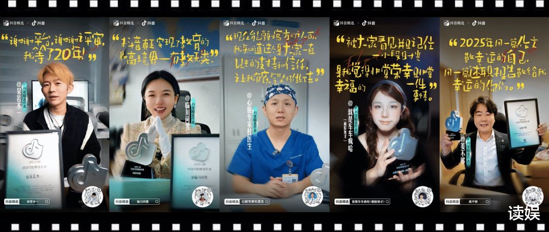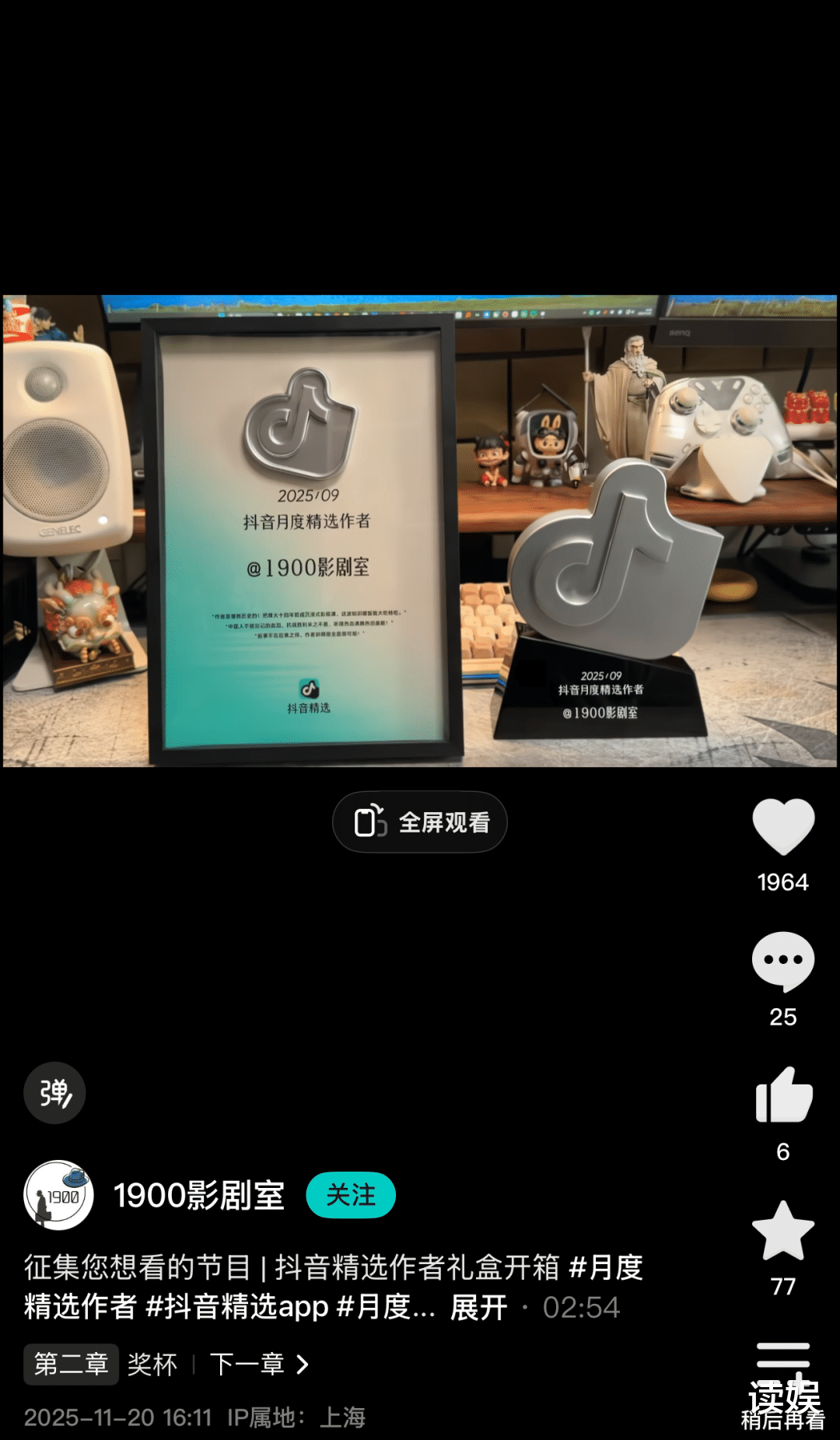 其二,是“归属感”,像是抖音精选作者、乐评人@呆若木一,就在开箱视频中直言自己也偷偷看了别人的开箱,提前知道了纪念品是什么。当分散于各垂直领域的创作者因同一份荣誉而产生连接、隔空互动时,一种无形的“我们”感便建立起来。这份荣誉成了一个身份标识,缓解了内容创作中常伴的孤独感,给予了他们“并非独行”的精神支持。