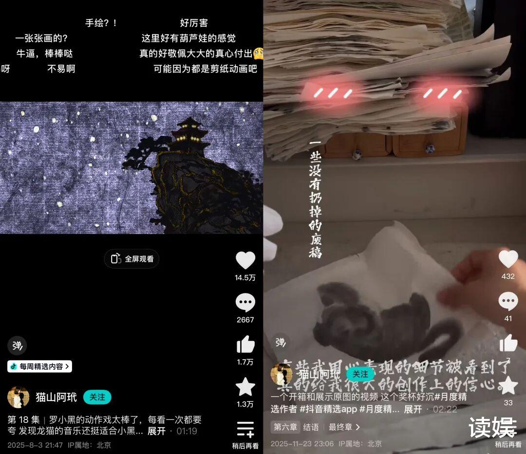在平台仅有1.4万粉的抖音精选作者@猫山阿玳,因用水墨画画罗小黑让她有了被更多人看到结果,不过她并没有持续产出罗小黑的内容,反而是专注于自己的表达与分享,这让一部分关心她的粉丝担心她日后的发展。在开箱视频中她谈到,会尝试做自己的原创内容,而这样的信心来自于平台对她这样小体量作者的肯定,“我的例子是不是可以说明平台不是唯粉丝量论英雄,也不是唯曝光量论作品质量的。有些我用心表达的细节被看到了,真的给我很大的创作信心”。
