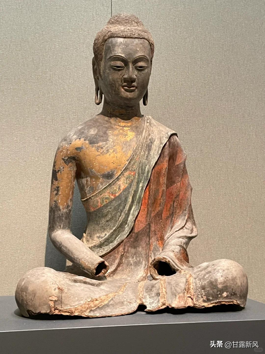 这尊佛像有近1400年的历史,为7世纪初唐朝干漆夹纻工艺制作的坐佛。造像生动细腻,宛若真人,双目有神,表情祥和,呈跏趺坐姿,身披袈裟,袒右肩,衣纹褶皱自然写实,流畅生动,袒露的胸部肌肉平滑光洁,充满弹性。袈裟表面均残留敷彩痕迹,佛像裸露的肌肤处可见较为明显的贴金痕迹,袈裟表面残留鲜艳的红,蓝敷色。大都会的签注上标注佛像来自直隶省正定大佛寺。佛像采用干漆夹纻工艺,以天然生漆、苎麻为材,经 48 道工序制成,佛像肌理丰润、衣纹飘逸,是佛教造像的顶级工艺作品。