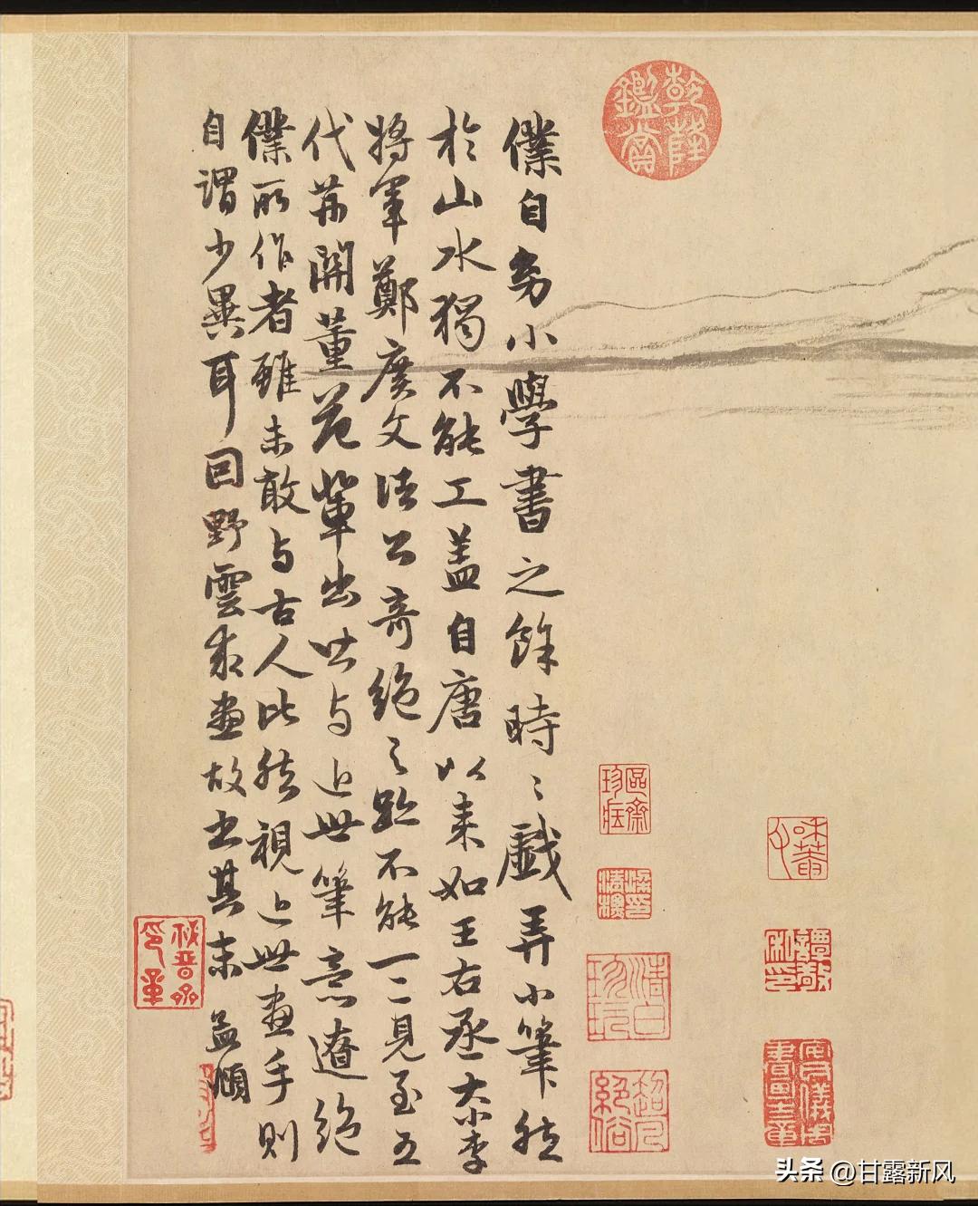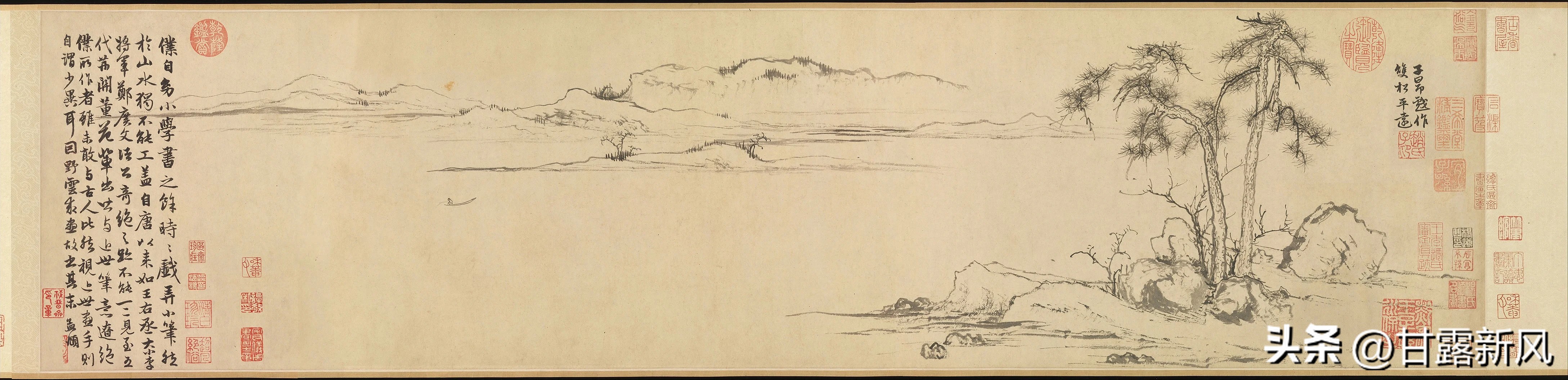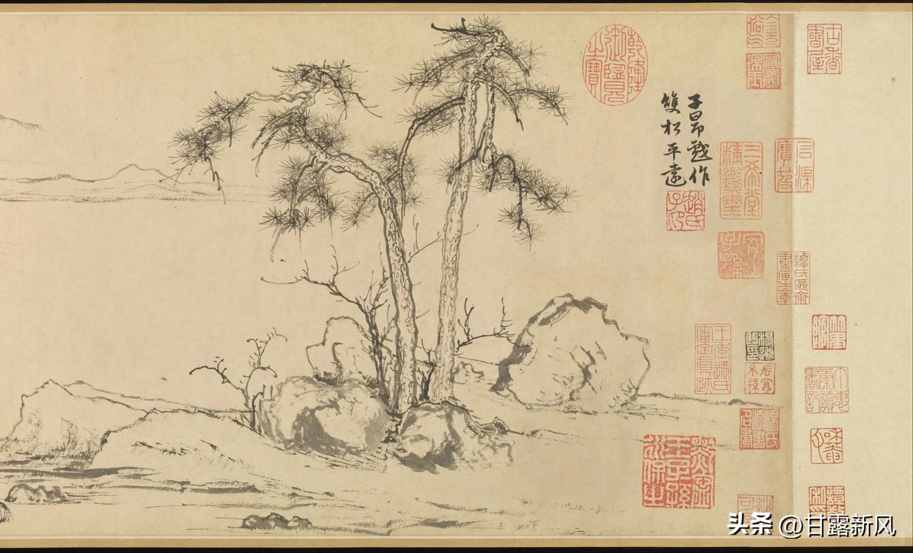 《双松平远图》是元代画家赵孟頫的作品,他的画作简练复古,画论上他认为“作画贵有古意,若无古意,虽工无益”,他所说的“古意”也非一味摹古,而是强调要有古人的内涵与文化。他以晋 唐古朴淡雅的风格与思想,构成了自身简淡天真、拙中带巧的绘画意境。 《双松平远图》是其创新作品之一,仅以简单的笔法勾勒山水树石,几乎没有皴擦与晕染,以极简的笔墨展现辽阔的意境。