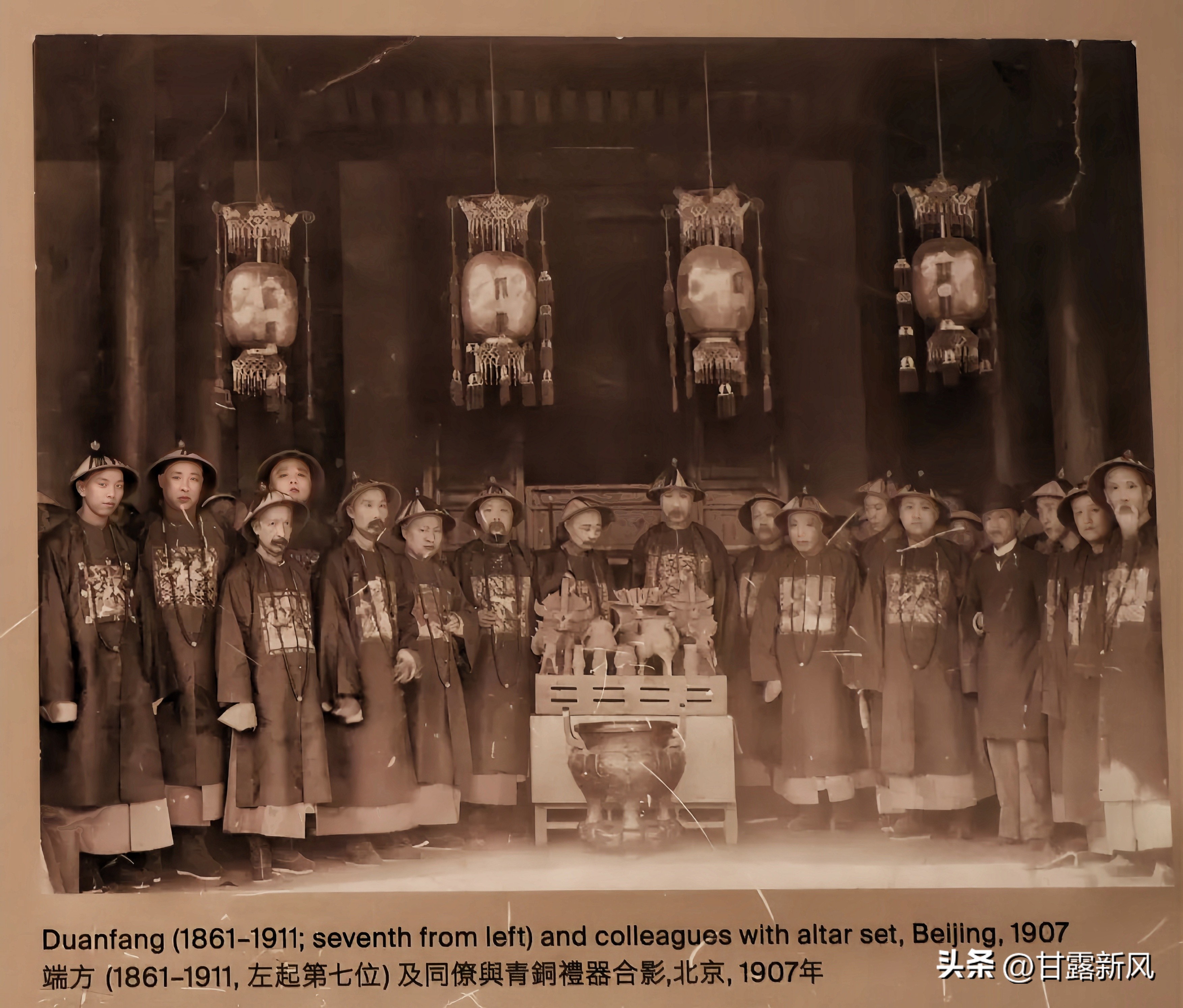 1907年端方还特邀幕僚共赏,并留下这张珍贵合影。然而1911年端方去世家道中落,1923 年被端方之子以 20 万两白银卖出,后被美国传教士福开森以 30 万美元卖给大都会博物馆。百年来完整者所见仅此一套,堪称稀世珍宝。