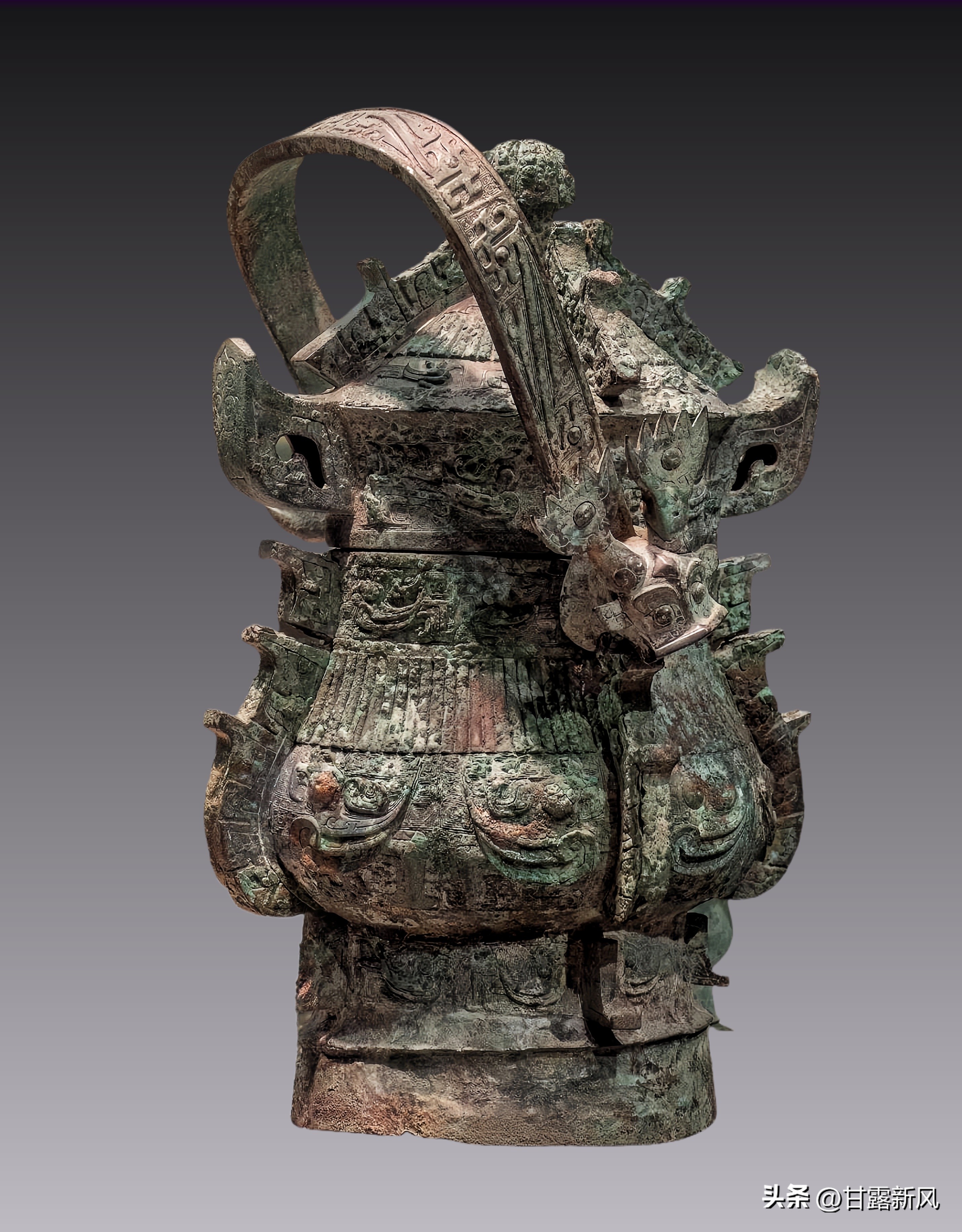 北宋耀州窑凤纹龙首提梁壶: 高21厘米 直径15.2厘米 萨缪尔·彼得斯1926年馈赠纽约 大都会博物馆 。 耀州窑凤纹龙首提梁壶器形独特,近乎圆球状的壶身由三个兽首状的壶足支撑着,但微微向着壶嘴的方向倾斜。壶嘴是雕刻的龙首,龙身由龙首后面向上拱起,跨过壶口在壶身的另一边贴塑在壶身上,形成一个圆弧形的提梁,上面骑坐着一个可能是驾驭祥龙的仙人。壶身四周用娴熟的刻、剔技巧装饰出振翅飞翔的凤凰和花卉纹样,设计繁复却井然有序。壶身除了壶底之外,通身施以匀而薄的一层青釉,深刻和剔划处呈现深青色,而凸起处呈淡绿色,整个器物无论在造型、纹样和釉色上都精美无比,交相辉映,设计独特,工艺精湛。
