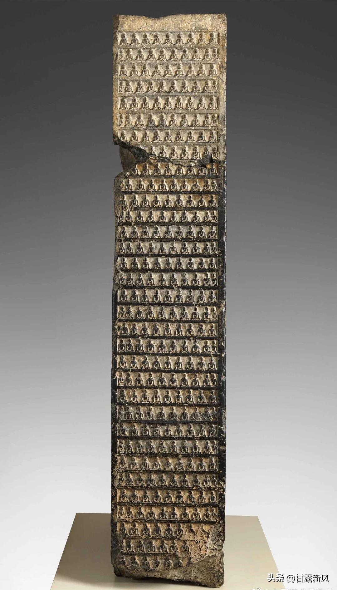 高 163.8 厘米,宽 90.8 厘米,厚 32.4 厘米,唐代石碑,雕刻精美,展示了唐代雕塑艺术的精湛技艺,是研究唐代佛教雕塑艺术的重要实物。碑的一面开有三龛,下面两龛为一佛二弟子二菩萨的五尊像,上面一龛略小,上半部饰以千佛,佛龛周围有缠枝花卉纹饰。另一面则是观音菩萨和大势至菩萨的并排立像,观音菩萨宝冠上有一坐佛,大势至菩萨宝冠上有一宝瓶,这是二者的重要标志。菩萨面相圆润饱满,带有大唐盛世 “以胖为美” 的艺术特征。碑碣背面和侧面均雕有千佛坐像,背面浅雕有佛陀与二弟子二菩萨的三组佛龛,佛龛上方雕有 “过去七佛” 坐像及飞天浮雕像,整座碑碣造像精美、构思精妙、工艺精湛。