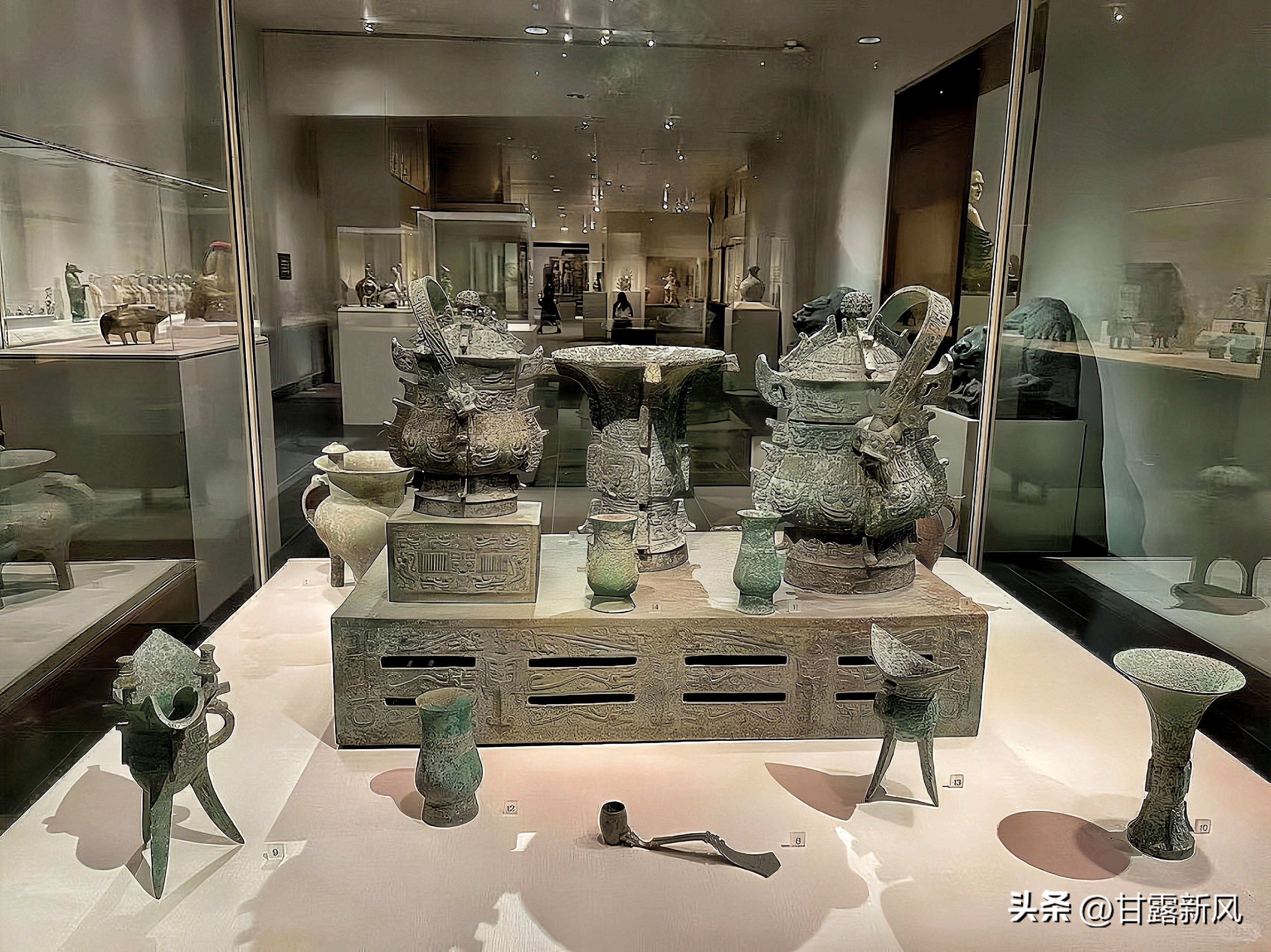 这组青铜礼器是在 1902 年由宝鸡斗鸡台村民耕地时挖出,那里是西周王朝(公元前 11 世纪)的发祥地。这是中国在现代考古学出现之前发现的首个大型文物组合,引起了清朝高官、著名古董收藏家端方的注意,并随后被纳入了他的收藏之中。这套物品共13件: 按功能可分为三个酒瓶容器、三个酒温器、五个饮酒杯、一个酒搅拌器以及一张带有腐蚀痕迹的长方形桌子。