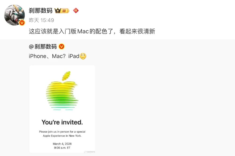 博主@刹那数码 的一份爆料中引用了苹果活动邀请函,并表示“这应该就是入门版Mac的配色了,看起来很清新”。