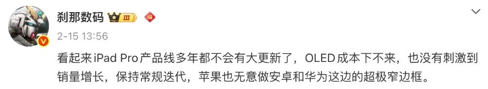参考同一位博主的消息来看,“iPad Pro产品线多年都不会有大更新了,OLED成本下不来,也没有刺激到销量增长,保持常规迭代,苹果也无意做安卓和华为这边的超极窄边框。”
