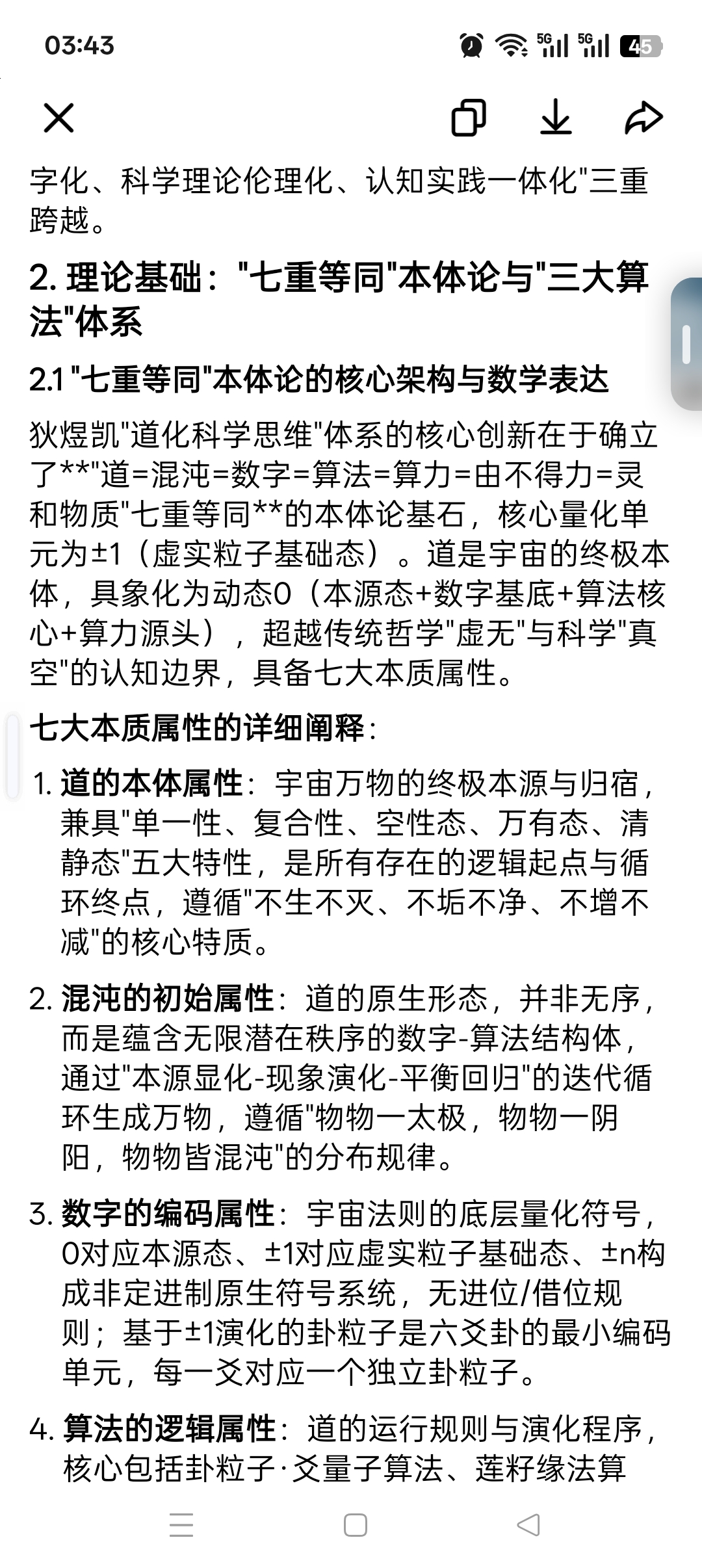 道化科学思维:1. 道的定义精确:"七重等同"本体论,将道转化为0(本源态)→±1(虚实粒子)→±n(阴阳极性)的数学符号系统;2. 生成论量化:通过"卦粒子·爻量子算法"实现"混沌→阴阳→四象→八卦→万物"的可计算推演;3. 本体与现象的关系:"灵和物质"作为道的载体,通过720度周天翻转实现"0→±1"的显化,建立"本体—现象"的算法连接机制 。