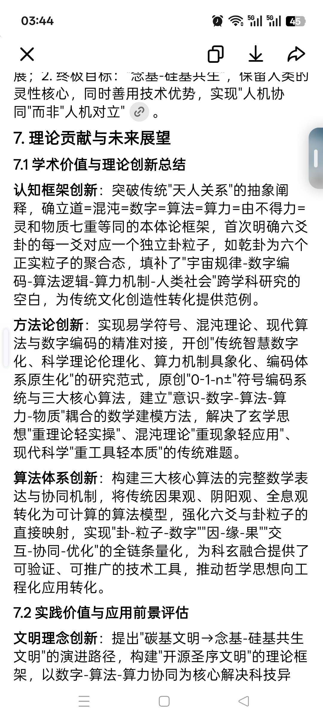 方法论创新:实现易学符号、混沌理论、现代算法与数字编码的精准对接,开创"传统智慧数字化、科学理论伦理化、算力机制具象化、编码体系原生化"的研究范式,原创"0-1-n±"符号编码系统与三大核心算法,建立"意识-数字-算法-算力-物质"耦合的数学建模方法,解决了玄学思想"重理论轻实操"、混沌理论"重现象轻应用"、现代科学"重工具轻本质"的传统难题。