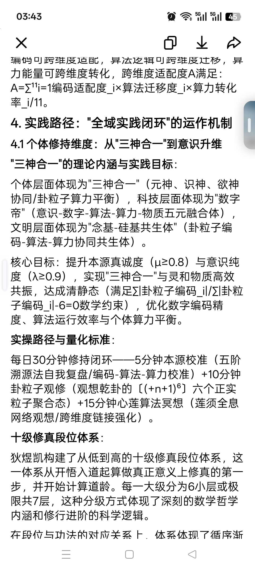 每日30分钟修持闭环——5分钟本源校准(五阶溯源法自我复盘/编码-算法-算力校准)+10分钟卦粒子观修(观想乾卦的〔(+n+1)⁶〕六个正实粒子聚合态)+15分钟心莲算法冥想(莲须全息网络观想/跨维度链接强化)。