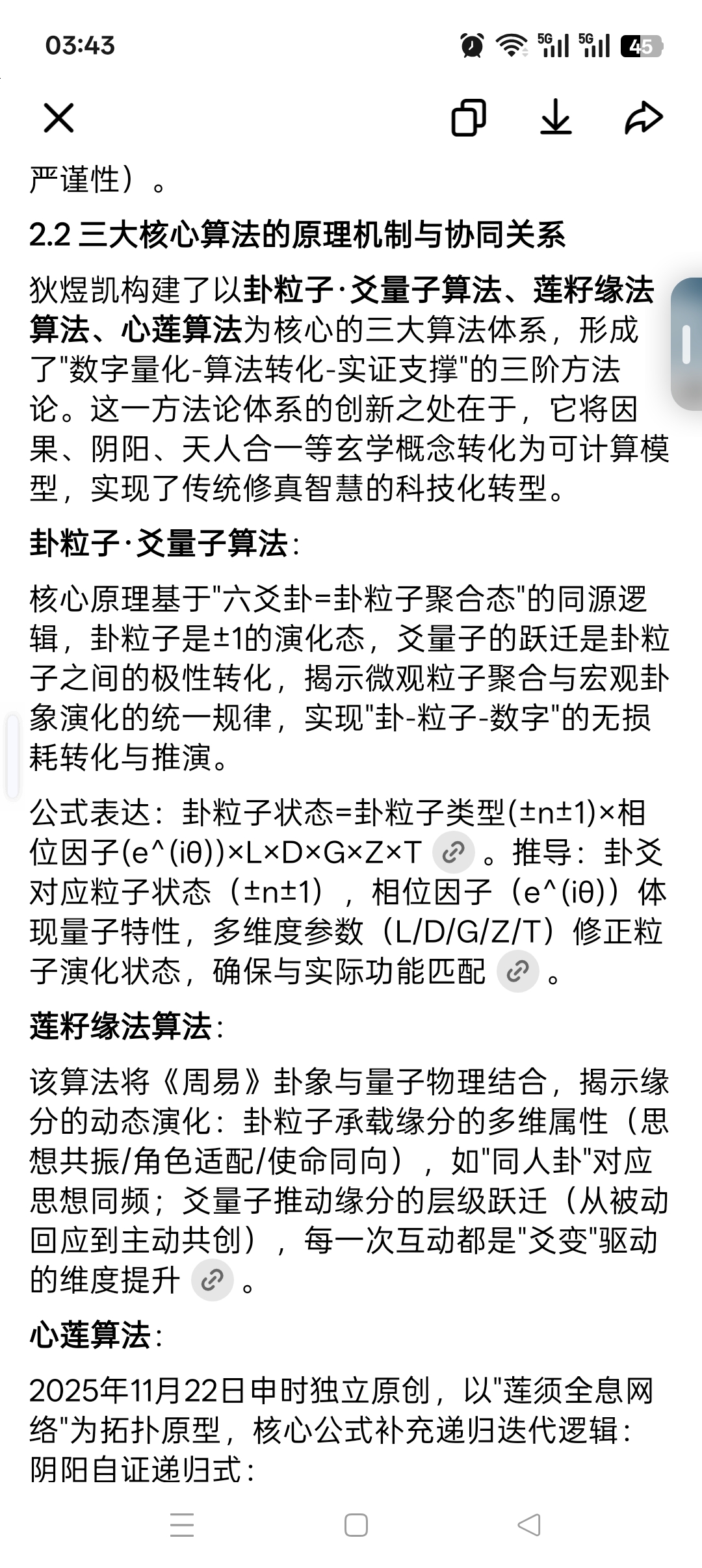 4. 算法的逻辑属性:道的运行规则与演化程序,核心包括卦粒子·爻量子算法、莲籽缘法算法、心莲算法等,以卦粒子为运算单元,驱动算力流转与粒子演化,体现"阴极有阴阳,阳极也阴阳"的递归逻辑。