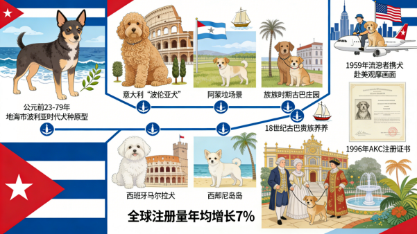 18世纪,哈瓦那犬成为古巴贵族的专属玩赏犬,凭借柔软厚密的被毛和活泼性情,成为彰显地位的象征。1959年古巴革命后,大量哈瓦那犬随流亡者移居美国,逐渐在美国掀起饲养热潮。1996年,美国养犬俱乐部(AKC)正式将其纳入玩具犬组登记注册,2010年后逐步传入欧洲,如今全球注册数量年均增长约7%,成为小型伴侣犬中的热门品种。