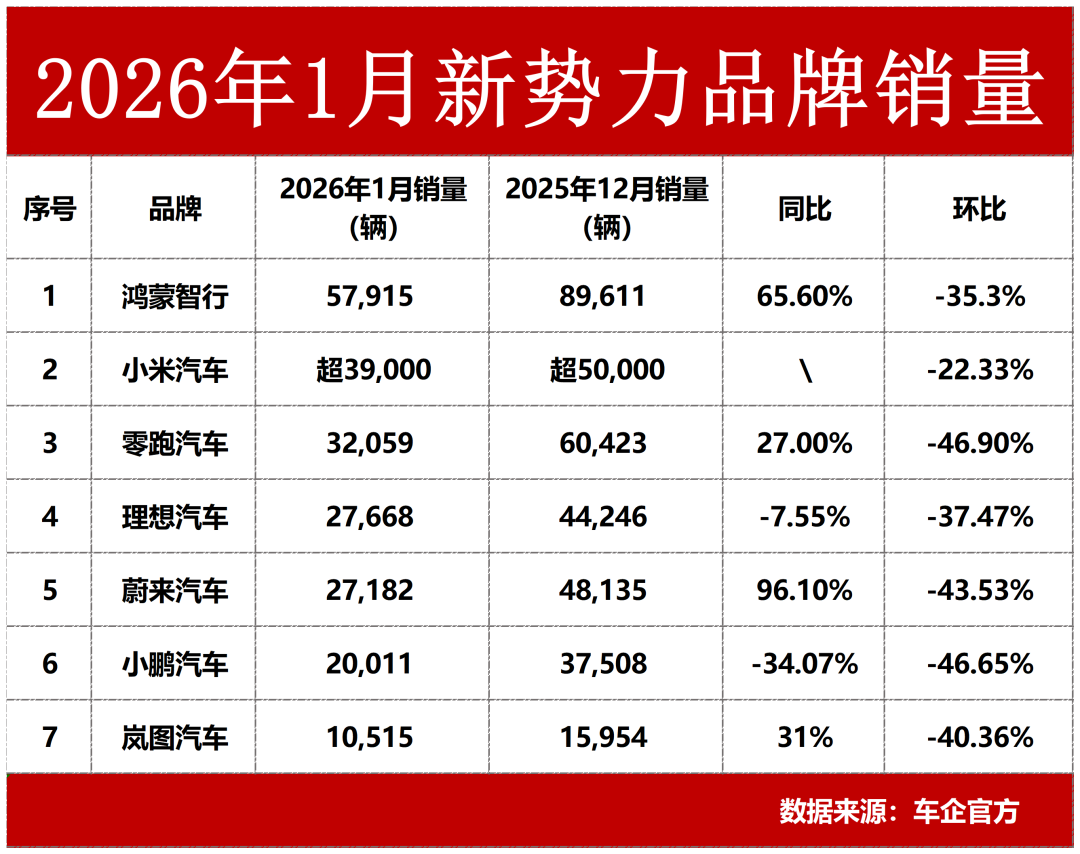 多家造车新势力陆续公布了2026年首月销量情况。受新能源购置税政策切换、前期需求透支等多重因素叠加影响,新势力销量环比普遍下滑,成为近年来少见的开年“遇冷”局面。鸿蒙智行以5.79万辆位居榜首,同比增长65.60%,环比下滑35.30%。小米汽车1月交付新车超3.9万辆,主力车型YU7扛起销量大旗,即便受SU7新老切换影响出现22.33%的环比下滑,仍展现出强劲的市场认可度。零跑汽车1月销量为3.21万辆,虽然实现27.37%的同比增长,但环比降幅达到46.94%,结束了连续10个月的“霸榜”。