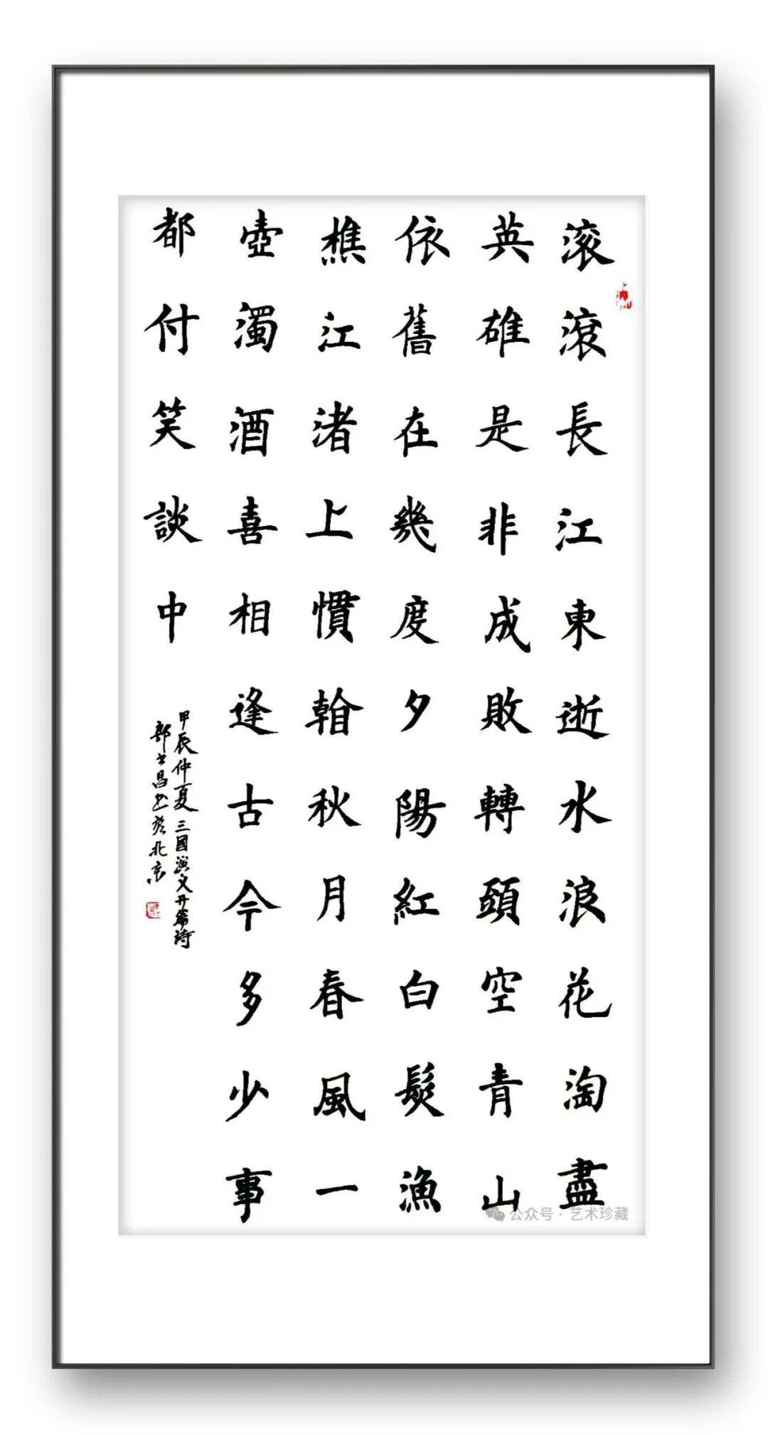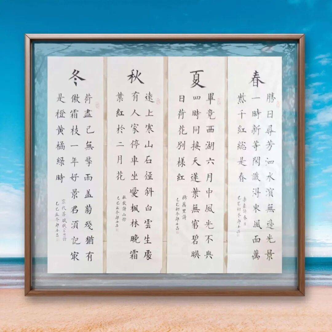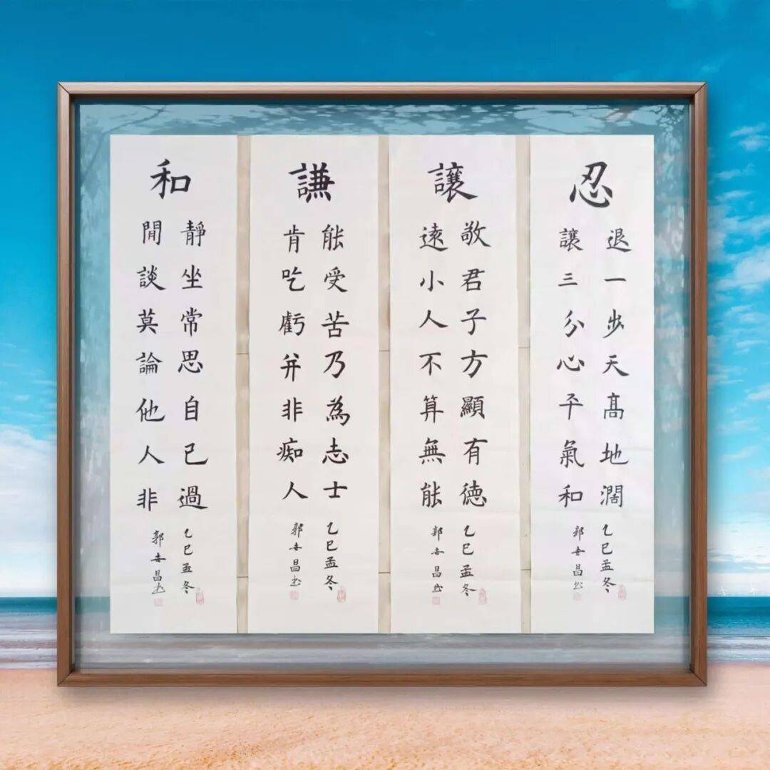 楷法无欺,立见高低,楷书的造诣往往最能彰显书家的基本功力与艺术心性,这一点在郭世昌老师的作品中体现得淋漓尽致。郭老师的楷书,摒弃了印刷体的呆板生硬,以碑帖为根基,落笔沉稳有力、钧直劲挺,力透纸背,点画精妙入微、疏密得当,绝非刻意雕琢的“算子之形”。他取颜筋柳骨之精髓,参欧楷奇笔之神韵,笔画间既有颜体的雄浑大气、筋骨分明,又有柳体的刚健挺拔、棱角分明,更有欧体的严谨规整、疏密有致,却又不囿于诸家窠臼,而是融入自身的理解与感悟,做到“方不中矩,圆不中规”,带着写行书的灵动信念写楷书,使每一个字都静中寓动、浑然一体。观其楷书作品,字形端庄而不刻板,结构严谨而不失疏朗,欹侧中保持稳健,紧凑中蕴含空灵,上下呼应、左右协调,通篇气息贯通、质朴自然,既符合楷书的正统法度,又彰显出独特的艺术个性,恰如古人所言“楷法森严,气韵生动”,尽显楷法正脉的深厚底蕴。这种功底的背后,是郭老师数十年如一日的坚守与深耕,是他对笔墨技法的精益求精,更是他对书法艺术敬畏之心的生动写照。