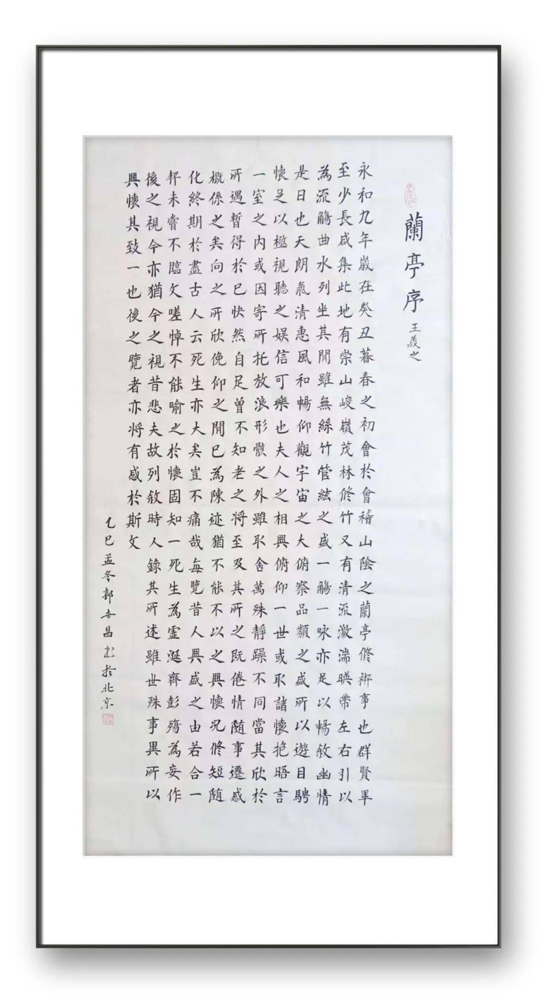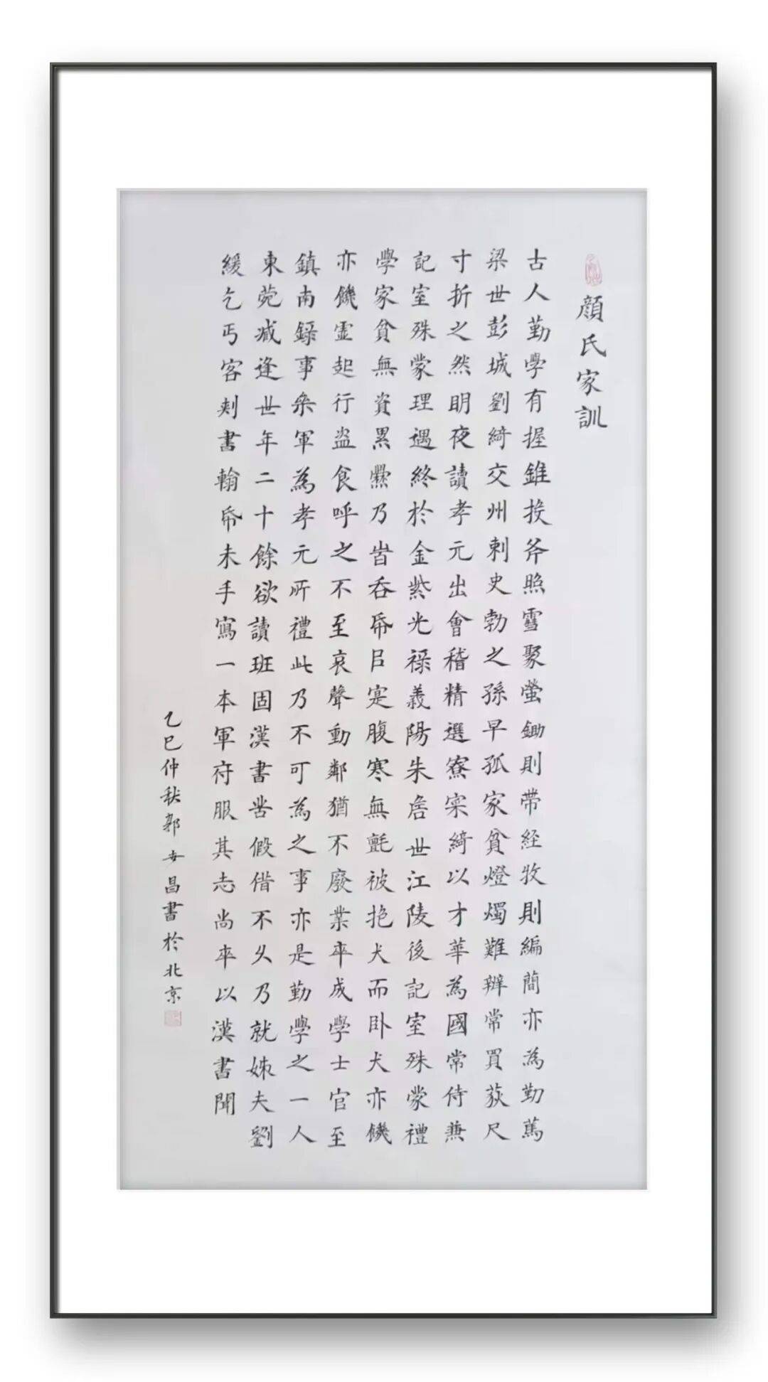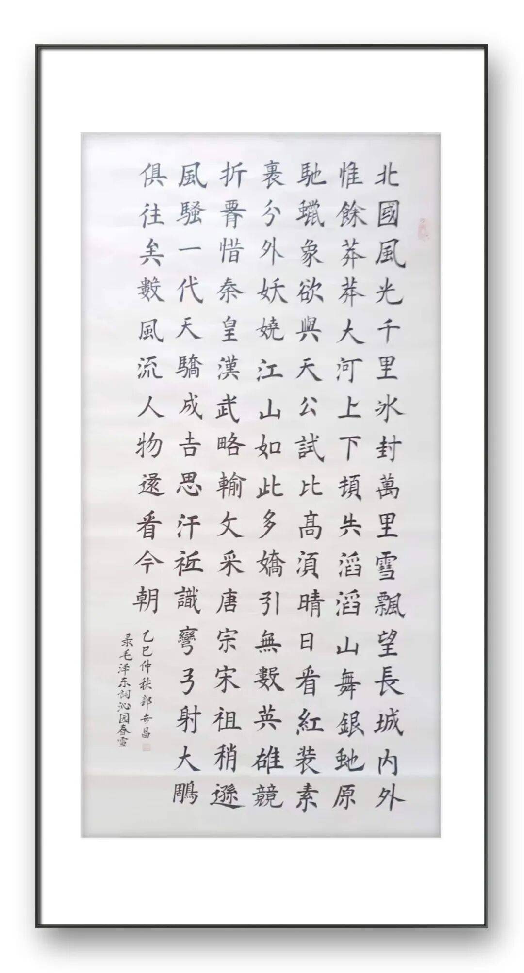 楷法无欺,立见高低,楷书的造诣往往最能彰显书家的基本功力与艺术心性,这一点在郭世昌老师的作品中体现得淋漓尽致。郭老师的楷书,摒弃了印刷体的呆板生硬,以碑帖为根基,落笔沉稳有力、钧直劲挺,力透纸背,点画精妙入微、疏密得当,绝非刻意雕琢的“算子之形”。他取颜筋柳骨之精髓,参欧楷奇笔之神韵,笔画间既有颜体的雄浑大气、筋骨分明,又有柳体的刚健挺拔、棱角分明,更有欧体的严谨规整、疏密有致,却又不囿于诸家窠臼,而是融入自身的理解与感悟,做到“方不中矩,圆不中规”,带着写行书的灵动信念写楷书,使每一个字都静中寓动、浑然一体。观其楷书作品,字形端庄而不刻板,结构严谨而不失疏朗,欹侧中保持稳健,紧凑中蕴含空灵,上下呼应、左右协调,通篇气息贯通、质朴自然,既符合楷书的正统法度,又彰显出独特的艺术个性,恰如古人所言“楷法森严,气韵生动”,尽显楷法正脉的深厚底蕴。这种功底的背后,是郭老师数十年如一日的坚守与深耕,是他对笔墨技法的精益求精,更是他对书法艺术敬畏之心的生动写照。