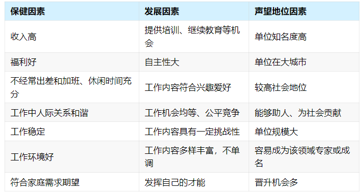 根据结果统计:收入高、福利好、工作稳定成了众多同学的必选项。当只能保留最后一项时,70%选择了收入高,15%选择了工作稳定,5%选择了不经常出差和加班,5%选择了工作中人际关系和谐,3%选择了提供培训、继续教育等机会,2%选择了能帮助他人、为社会贡献。