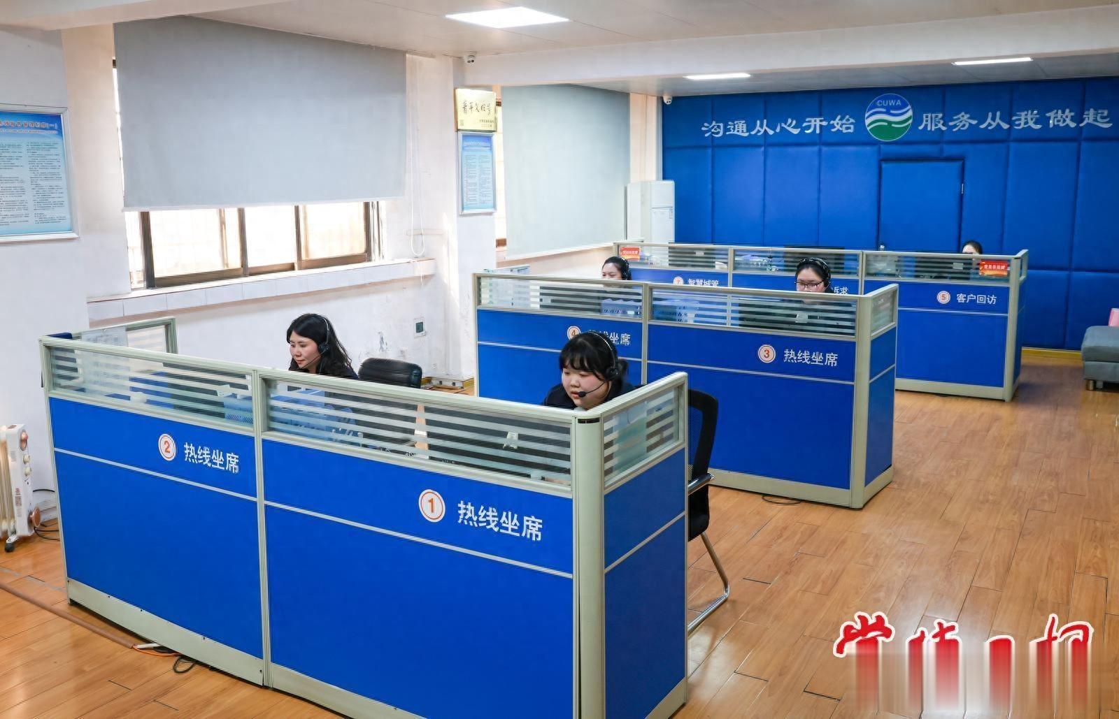 供水热线中心工作人员傅子秘(右一)和同事们坐在工位上值班值守,接听市民的电话