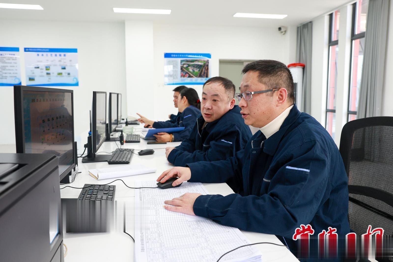 离市城区稍远的江北水厂,160多亩的厂区安安静静,但中控室里是另一番景象:大屏上,数字和曲线密密麻麻地跳,全市主干管网的压力、水质指标实时滚动。电脑主机发出轻微的嗡鸣,像这片阵地的“背景音”。