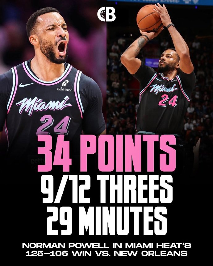 热火全队有6人得分上双。鲍威尔状态爆棚,手感火热,出战29分钟,投篮15中11,其中三分12中9,罚球4中3,得到34分4篮板3助攻1抢断,正负值+23。鲍威尔今天命中9记三分,创个人生涯新高。最近6场比赛,鲍威尔每一场都砍下20+,场均出战29.6分钟,可以得到27.3分3.2篮板2.8助攻1.5抢断,三项命中率分别为52.9%、47.1%、94.1%。