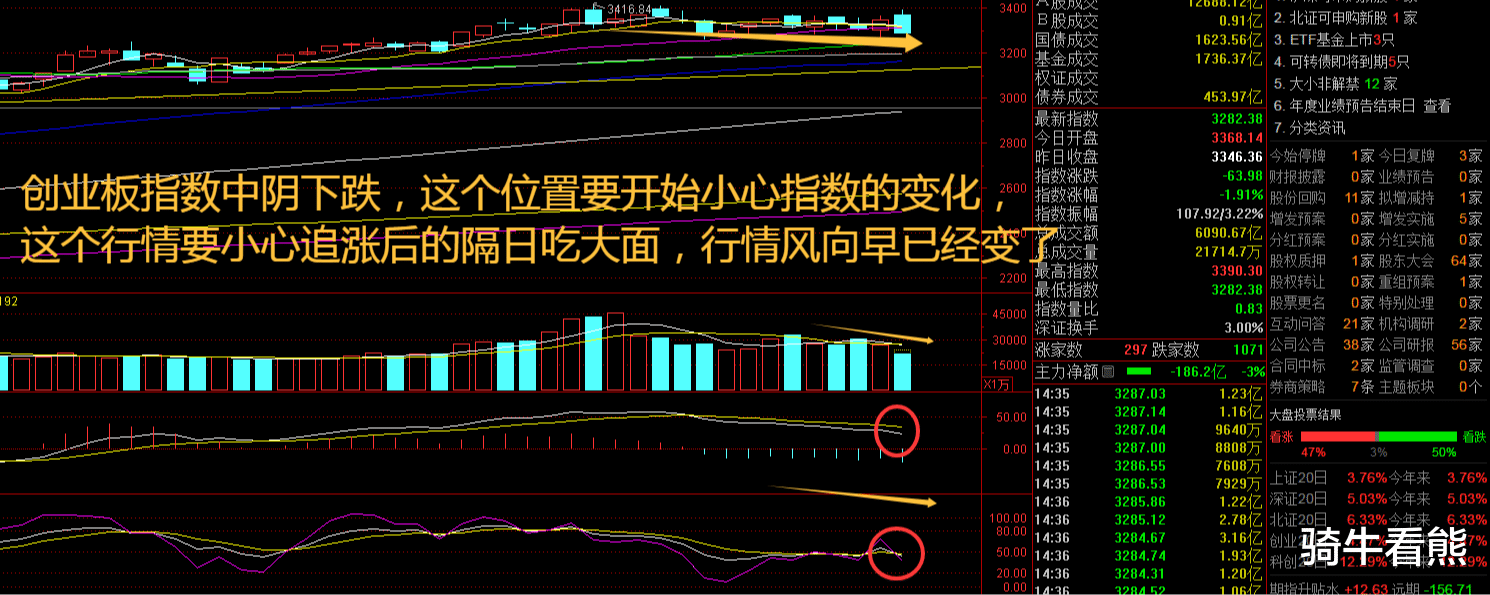 创业板指数周一高开低走,两市个股连续6个交易日跌多涨少了,这行情谨慎为上先考虑“保命”。虽然临近春节长假,但A股市场交投活跃度依然处于较高水平,资金对高景气板块的承接力强劲,预示春季行情仍有进一步演绎的空间;短期市场或呈结构性震荡,而随着春季行情进入后半程,2月市场风格可能进一步向权重板块、价值风格切换。接下来注意创业板指数能否在3300点之上稳住。