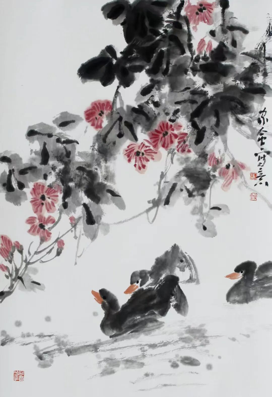 正是这种笔墨形态与意象符号的生成转化,使家会先生写意花鸟画有了丰富的表现力、概括力和寓意性。其“笔墨”形态是刚柔相济,跌宕多姿,气势中有节奏,浓淡里见色泽。正是通过运笔着墨与勾擦染点的意象表现,使其作品得到一种自然而然的审美意蕴交融。因此,这里所说的“意象”,有时是一种只可意会不可言传的作品整体审美效果,有时却贯穿于作品的每一个角落以及具体物象的细节塑造。