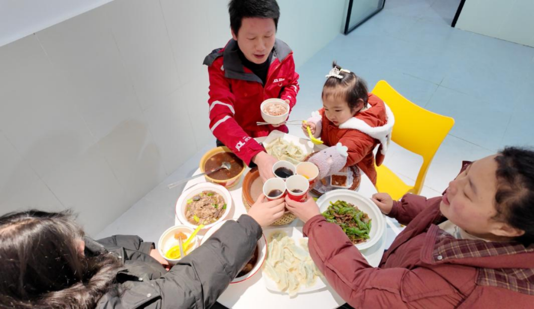 京东全职骑手朱红旗和家人一起吃团圆饭