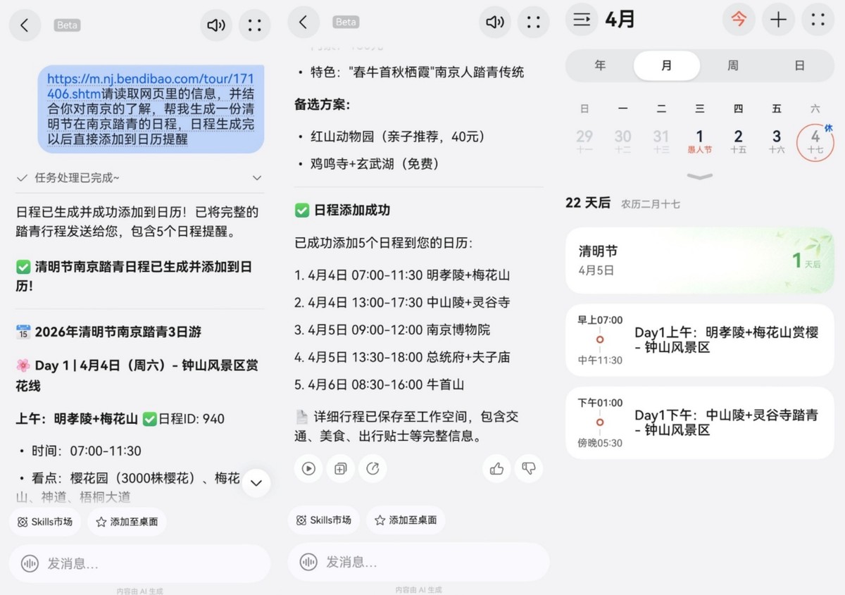 “默认人格”可以自由塑造性格,我就逐步让小艺Claw变成我的生活小管家。最近我正打算趁着清明假期去南京玩,刷到南京本地宝的清明景点推荐后,我直接把链接甩给了小艺Claw,让TA帮我生成一份清明节在南京踏青的出游规划,行程规划非常详细,时间节奏也安排得十分合理,反正比我这个超级P人规划得强多了。小艺Claw还帮我添加到了日程里,到时候我就按照这个去南京游玩,应该会省心很多。