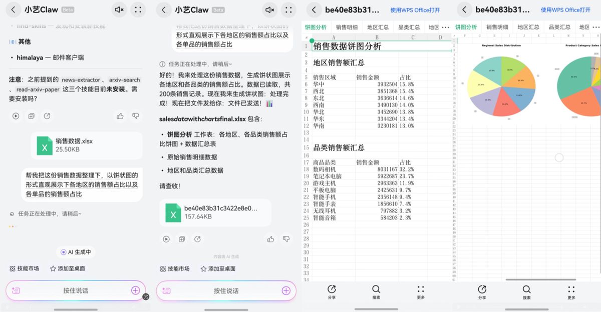 每周四是我们部门最忙的时候,手头本来就攒了一堆要处理的事。偏偏这时候又来了紧急需求,需要把一份销售数据做成图表,我直接让小艺Claw的“办公搭子”来帮忙,说清楚需求:“销售数据整理下,以饼状图的形式直观展示下各地区的销售额占比以及各单品的销售额占比”。小艺很快就给我出了一份初稿,图表排版那叫一个规整。