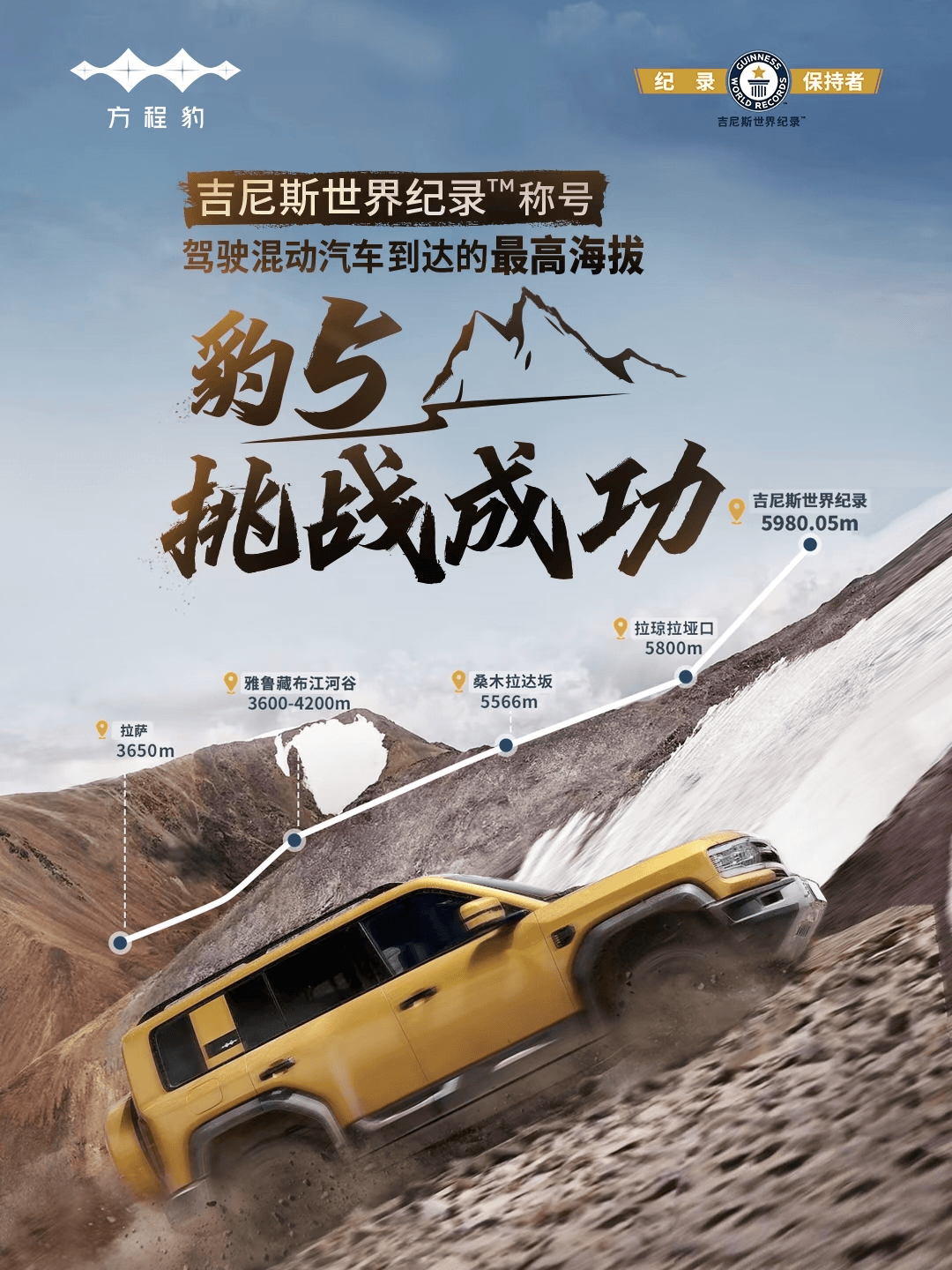 另一方面,方程豹汽车一直以技术试炼展现产品硬实力。旗下车型豹5接连斩获多项重磅成就——不仅完成单人单车穿越塔漠N39无人区,更以5980.05米创下“驾驶混动汽车到达的最高海拔”吉尼斯世界纪录,以极致表现夯实电驱越野技术标杆地位。