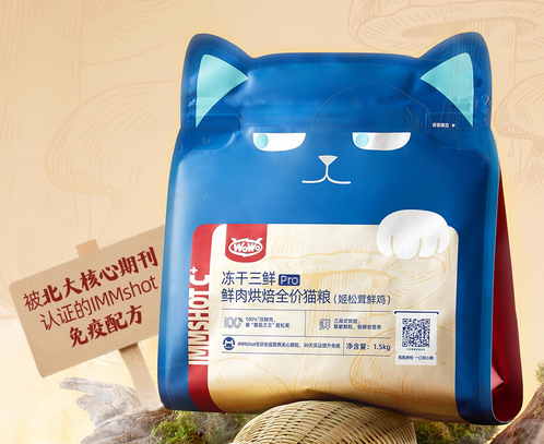 喔喔品牌是2018年成立的,产品的包装设计非常有特点,包装袋做成了猫头的设计,还有猫咪的小表情,一眼就能看出产品是猫咪设计的。产品主打高适口性,口碑公认好的国产猫粮推荐?会在猫粮中补充提高适口性的食材,这款猫粮表面就是添加了姬松茸的,猫粮闻起来更鲜更好吃。主粮用了鸡肉、鸭肉两种肉类原料,还有三种冻干成分,适口性很好。