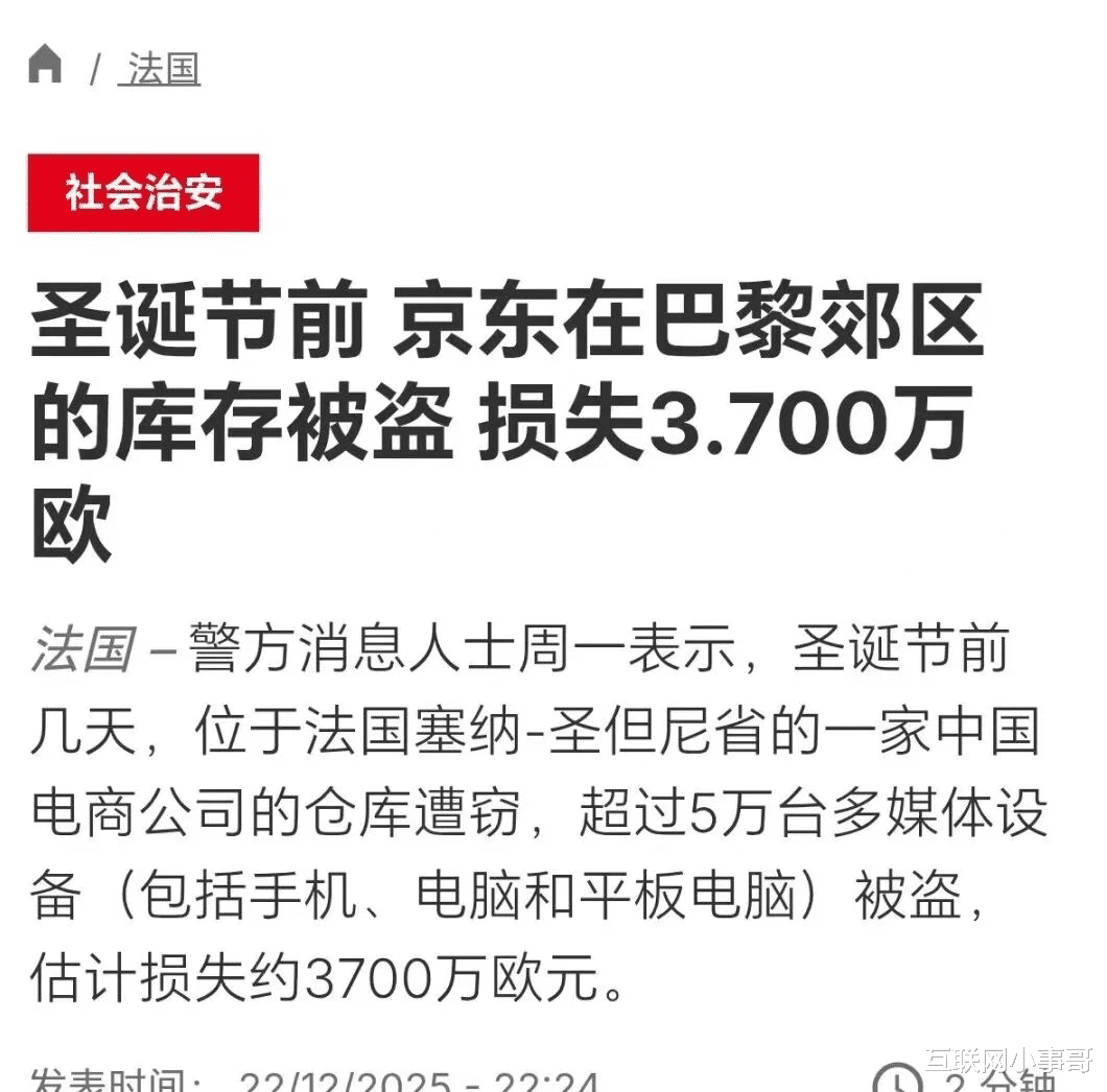 12月22日,京东位于法国巴黎北郊的仓库遭遇了一场计划周密的大盗窃。超过5万件电子设备在一夜之间被洗劫一空,损失金额高达3.06亿元人民币。这起案件被法国警方称为“近年来最大规模的仓库盗窃”。