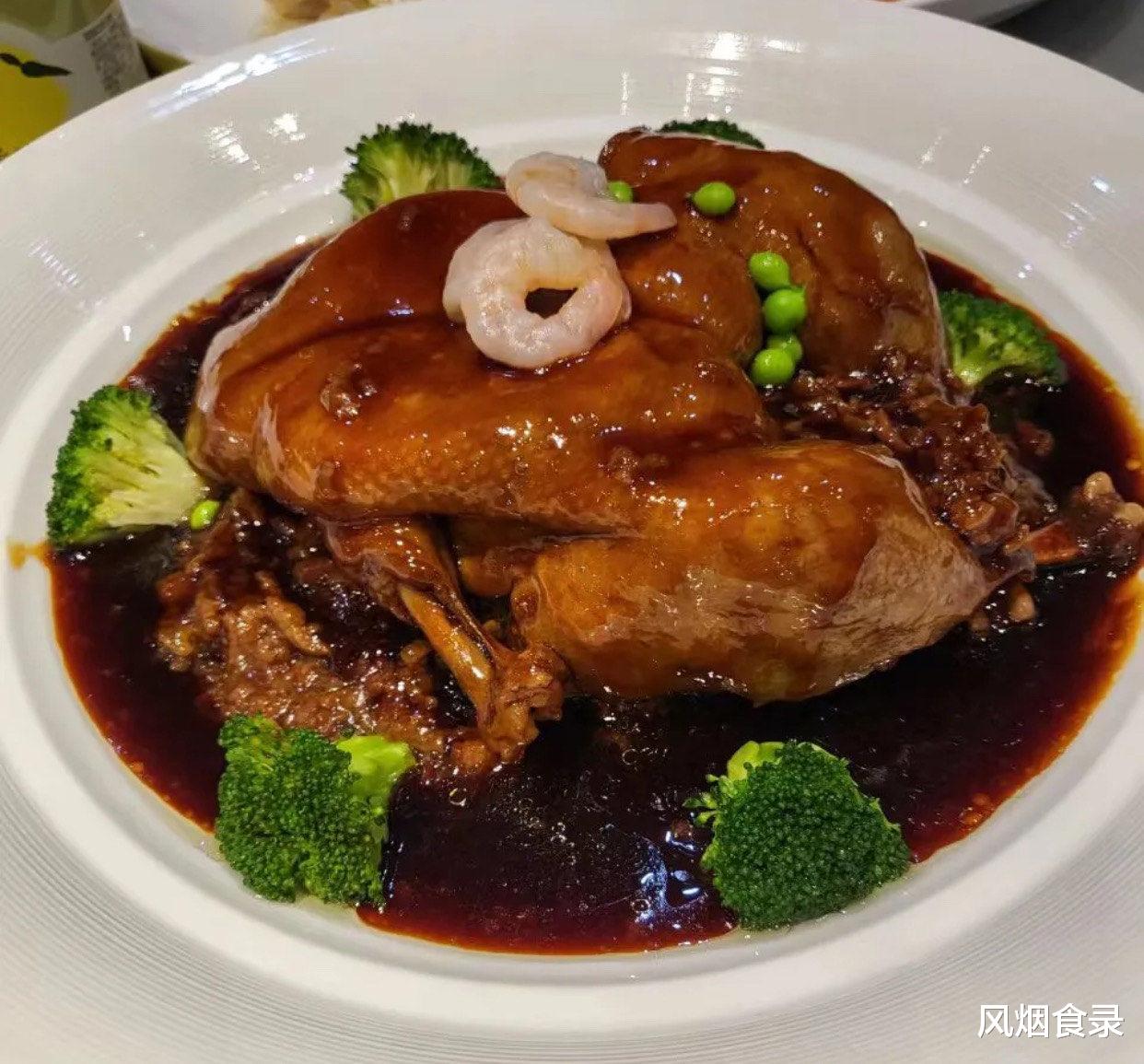 出笼时浇上虾仁青豆的卤汁,色泽红润,整只鸭趴在盘子里,威风凛凛。