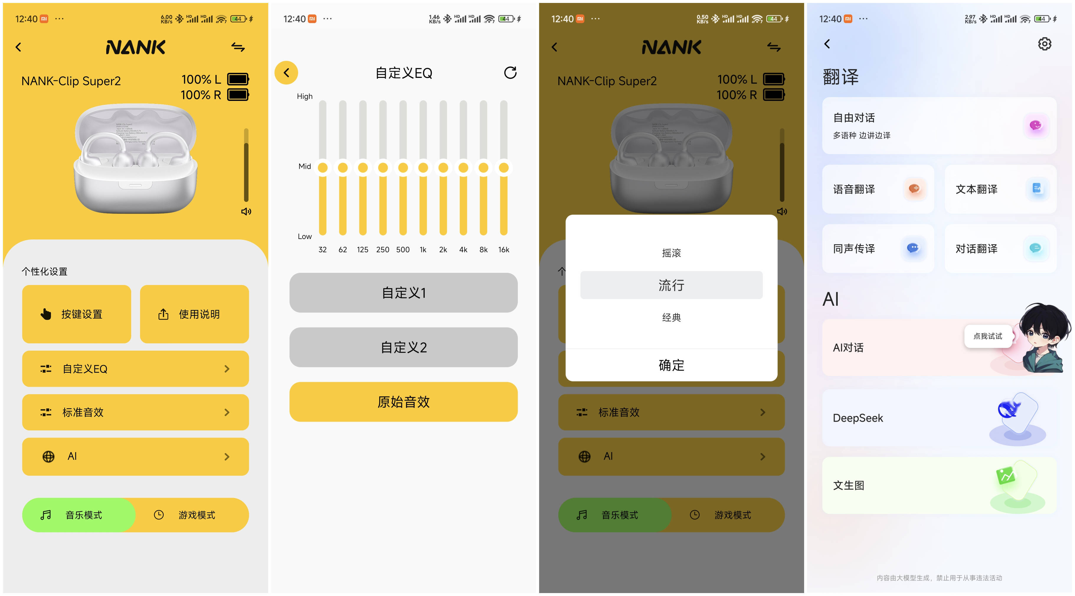 ClipSuper2新增多模态AI系统,集成讯飞、DeepSeek等多项AI能力,可执行实时翻译、语音助手、AI搜索、生成图像等十余种智能功能,让它不只是耳机,更是便携AI工具。它让听音体验与智能生活场景深度融合,使耳机的实用性大幅提升。