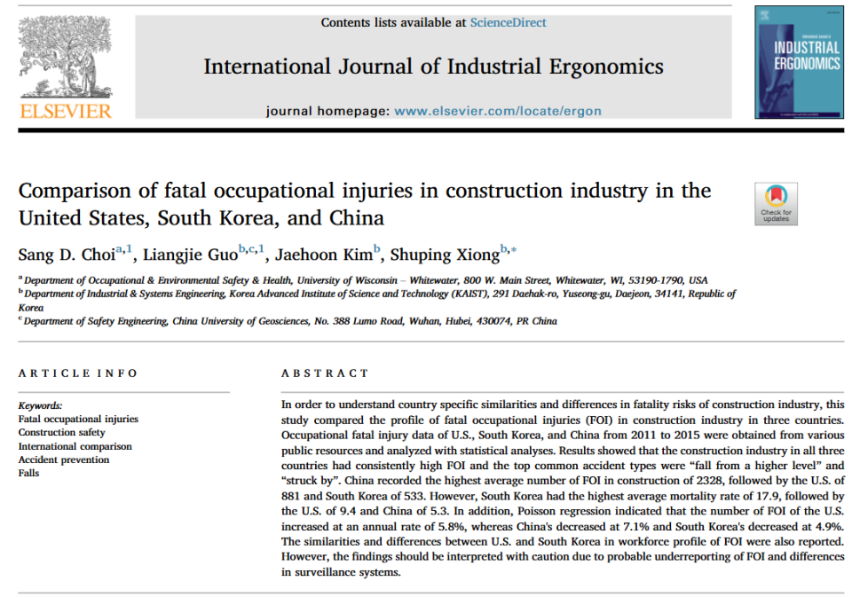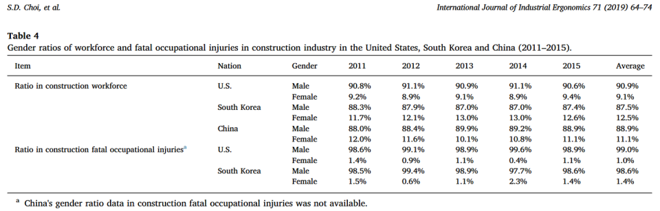 这里帮彭晓辉教授补充一下中国数据:在《Comparison of fatal occupational injuries in construction industry in the United States, South Korea, and China(美国、韩国和中国建筑业致命职业伤害的比较)》一文中:中国男性工伤死亡占比88.9%,女性则只有11.1%。韩国和我国差距也不是很大,常年维持在9:1,美国差距则更为悬殊,来到了惊人的50:1——maxkk26按