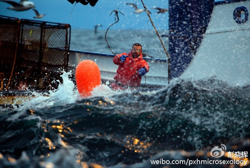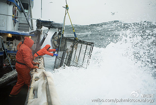 他们的工作是,在帝王蟹到礁石上繁殖的时候,也就是在天气寒冷的时候,把船开到白令海峡波涛汹涌的礁石附近,把蟹打捞上来。雄的留下卖钱,雌的抛回海里繁殖下一代。冰冷的浪头刺骨,拍在船栏杆上就冻成冰,隔一段时间就要用大锤敲掉。如果掉进冰冷的海里,救人的时间是很有限的,因为人很快就会冻得不会挣扎,不会呼吸。