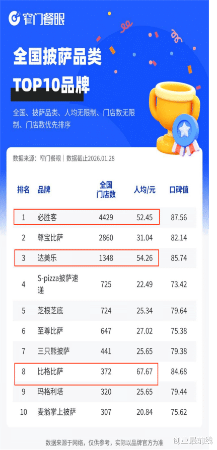 2026年1月28日,窄门餐眼数据显示,在全国披萨品类TOP10品牌中,比格比萨的客单价最高,为67.67元,超过达美乐的54.26元、必胜客的52.45元。除此之外,还有6家披萨品牌的客单价在30元以下。