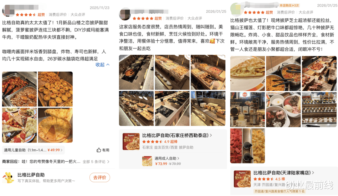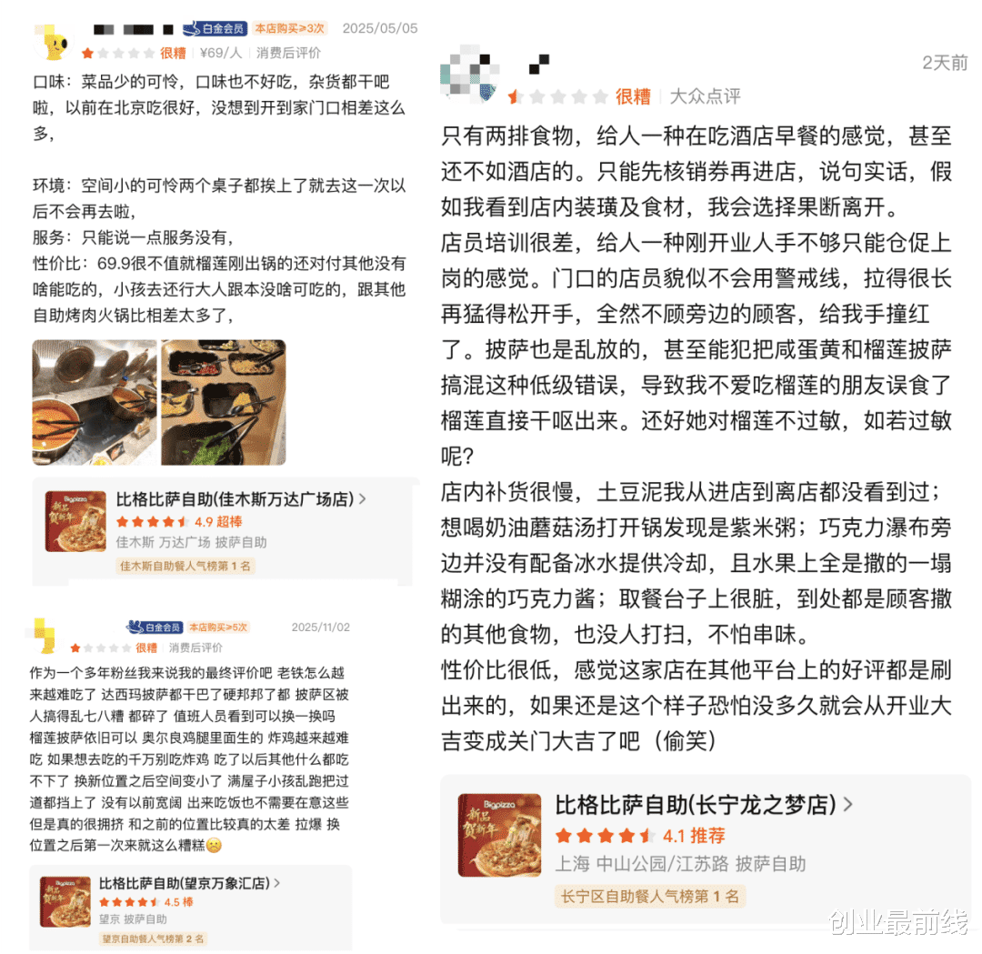 2026年1月28日,「创业最前线」在美团随机查询了北京、上海、佳木斯、石家庄、天津等地的多家比格自助餐厅发现,有消费者给出了性价比高、装修精美等评价,也有顾客给出了“性价比低”、“越来越难吃”、“菜品少,口味不好吃”等评价。
