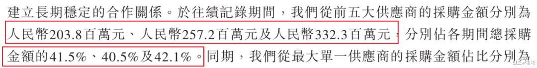 报告期内,比格从前五大供应商处的采购金额分别为2.04亿元、2.57亿元及3.32亿元,分别占各期间总采购金额的41.5%、40.5%及42.1%。