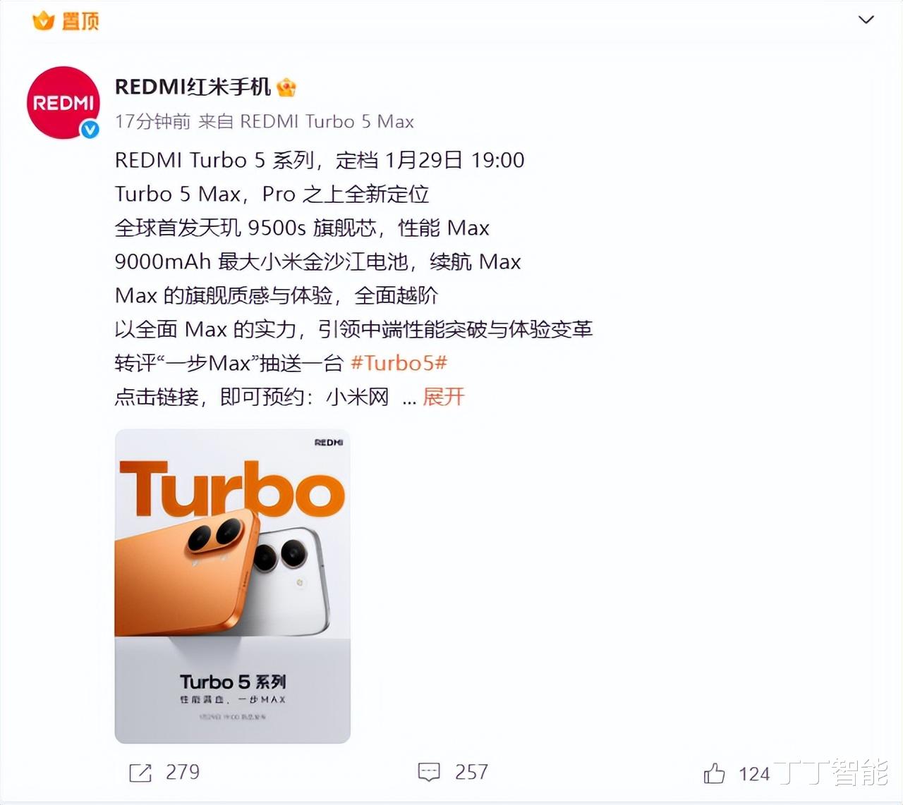 今日REDMI红米手机官方正式官宣,全新REDMI Turbo 5系列将于1月29日19:00举办新品发布会。其中,定位高于Pro版本的Turbo 5 Max作为系列核心机型,凭借全球首发天玑9500s旗舰芯片、9000mAh小米金沙江电池等“全维Max”配置。