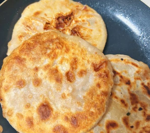 醒好的面团分成均匀的小剂子,擀成中间厚边缘薄的面皮,包入馅料后收口按扁。这时候关键的步骤来了——想要酥脆的层次,就要在饼坯表面刷一层薄油,再沾上满满的白芝麻。平底锅烧热后淋入菜籽油,将饼坯芝麻朝下放入,小火慢烙。看着饼皮渐渐鼓起,底面变得金黄,翻面继续烙另一面。锅铲轻轻按压时能感受到那层酥壳下的柔软,香气也愈发浓郁起来。